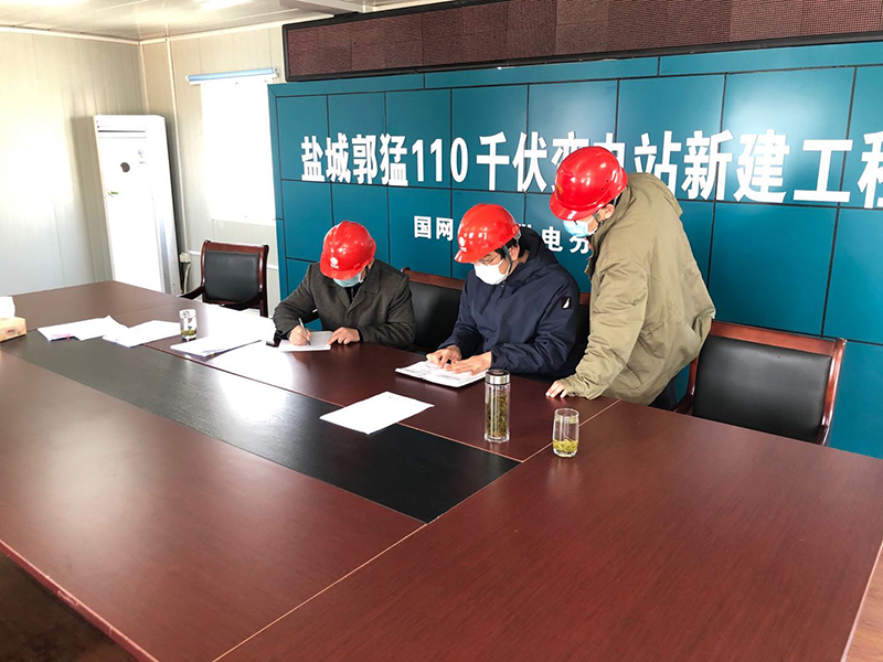 2020年3月4日上午,郭猛变通过盐城供电公司网上复工审批,同意复工后,盐城供电公司建筑部主任王育飞、安全质量专职杨义,国网江苏省水电工程咨询有限公司盐城片区主任刘向东赴我公司郭猛变电站检查指导春节复工的相关工作。项目经理潘战平等各项目部管理人员陪同检查。